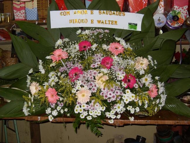 Arranjo para tumulo com flores do campo e gerbéra, feita com flores frescas da época.