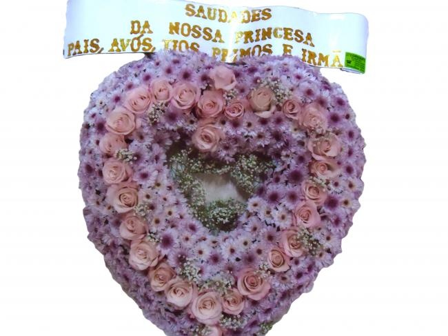 Coração de flor do campo rosa e rosas em tons claros, feita com flores frescas da época.